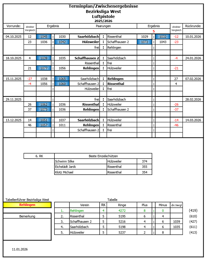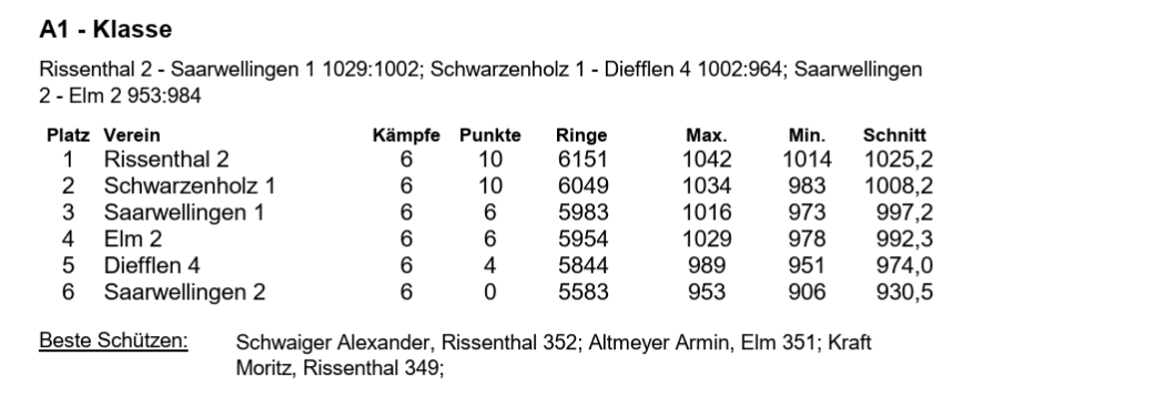 Ergebnisse Rundenkämpfe Luftpistole Rissenthal 2 - Schwarzenholz 1 1019 - 983 Alexander Schweiger 341 Ringe, Moritz Kraft 341 Ringe, Michael Britz 321 Ringe und Christopher Herrmann 337 Ringe.